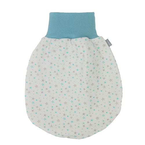 Praktischer Strampelsack aus weichem Jersey weiß mit blauen und hellbraunen Sternen .