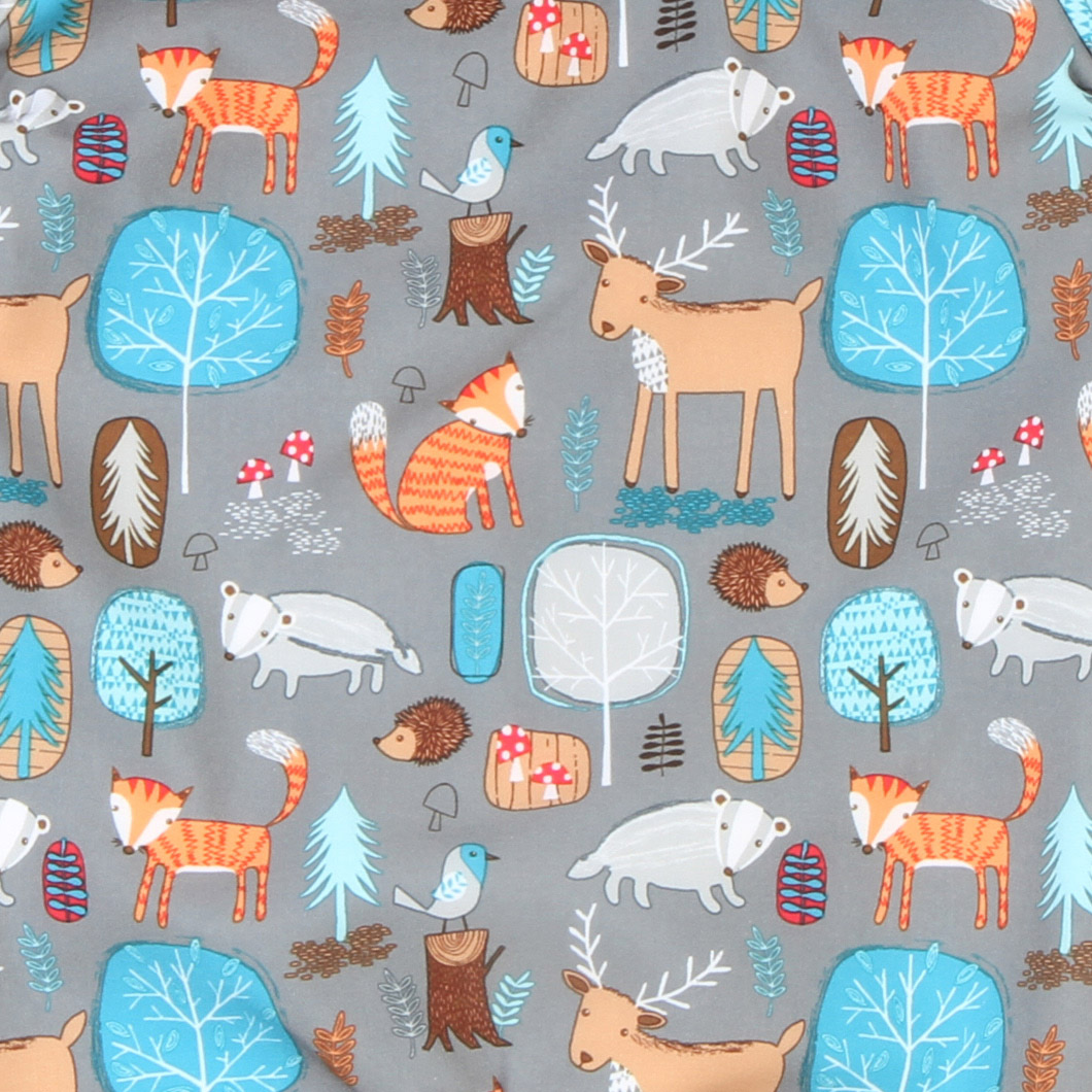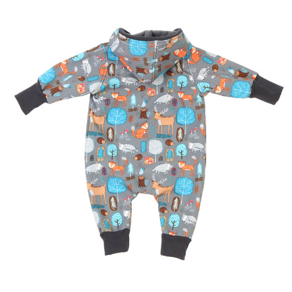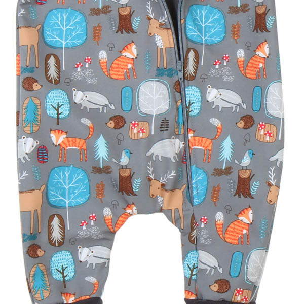 Praktischer Softshell Overall in Grau mit niedlichen Waldtieren und farblich passenden Beinbündchen.
